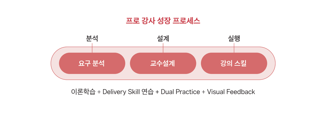 | 강의 스킬 기본 | 1. 강의 시작과 준비 요령 2. 강의 중 시선 처리/Voice Technique/제스처와 표정 3. 기타 상황 대응 : 질문 방법, 난처한 상황 대응, 판서하기 | 강의 팀 토의 실습 |