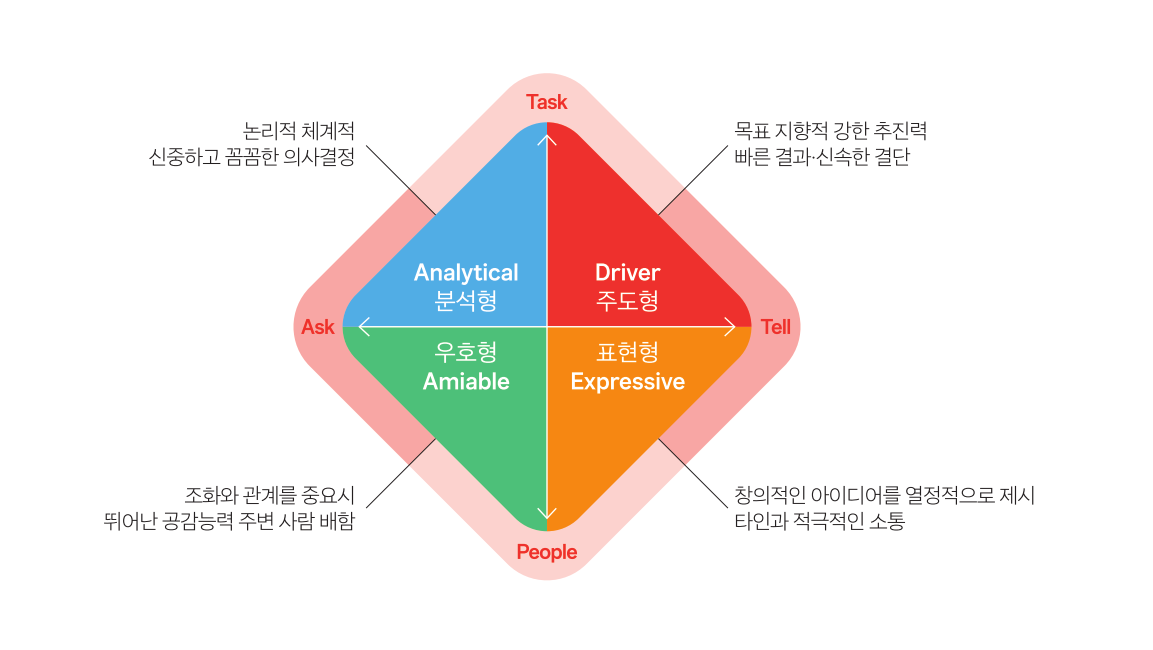 | 소셜 스타일 | 1. [Activity] 너로 말할 것 같으면 ㆍ문장들을 읽고 각 문장에 해당될 것 같은 조원을 선정하며 유형을 추측해보는 활동 2. 소셜 스타일의 4가지 전제/겉으로 표현되는 언행 3. 사고 개방도와 감정 개방도 | Activity 토의 강의 |