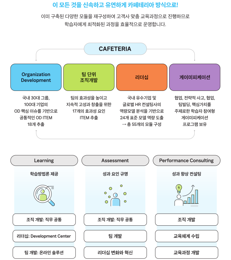 조직 개발, 팀 개발, 리더십, 변화와 혁신, 직무 공통역량의 주요 영역에 대한 성과 향상 컨설팅 (Performance Consulting), 성과 요인 규명(Assessment),