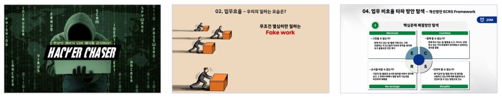 | 일하는 방식 변화 필요성 | 1. 일하는 방식 변화 필요성 체험: 헤커를 잡아라 Activity 2. Activity에서 일하는 방식의 변화를 통한 성과 창출을 위해 필요했던 것은? - 비효율의 제거, 핵심 목표의 명확화, 핵심 업무에 집중, 팀 커뮤니케이션 활성화 3. 우리가 집중해야 할 일하는 방식의 변화란? - Fake Work(비효율 요인)을 줄이고 성과를 내는 본질(Real Work)에 집중하는 것 4. 일하는 방식 개선을 위해 다르게 생각하고 다르게 행동하기 - 현상 유지에 이의를 제기하는 질문: Why, Why not, What if - 업무 현장의 불편함을 관찰하기 - 소통 활성화를 통한 아이디어 확장과 연결 - 실행(Prototype)과 개선(Refine)을 통한 아이디어 구체화 하기 | Activity 토의 강의 |