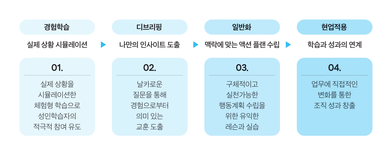 OD 카페테리아는 성인 학습자의 특성을 고려하여 경험학습(Experiential Learning) 방법론으로 설계되었습니다.