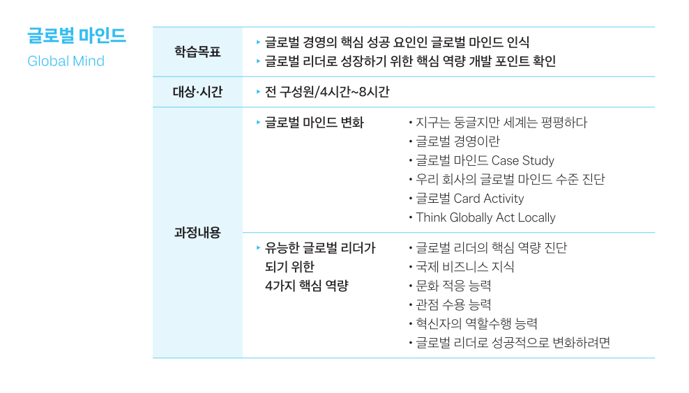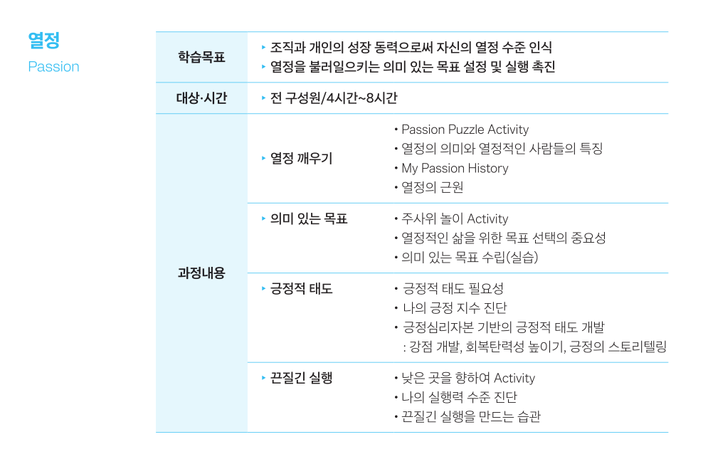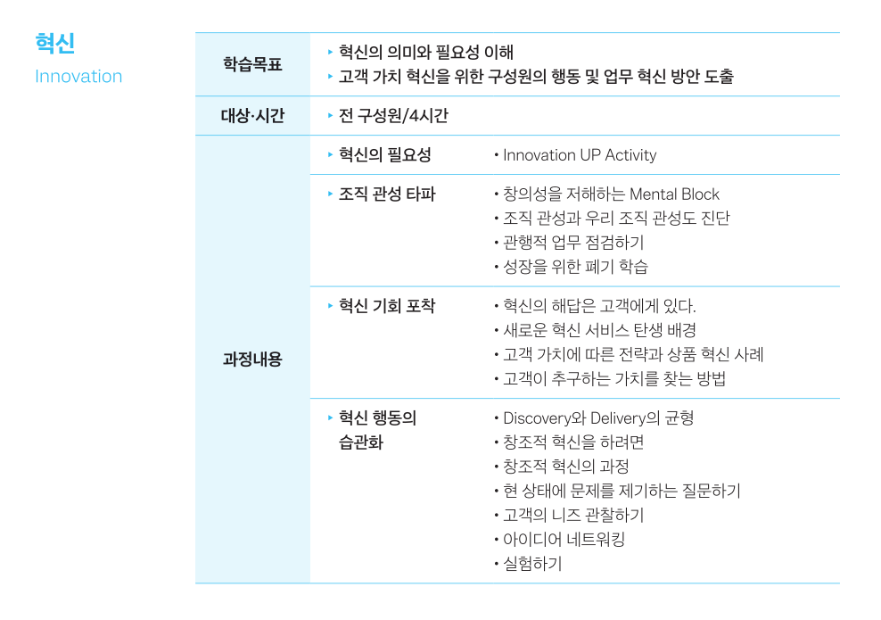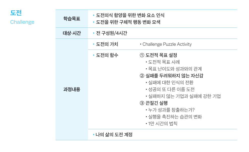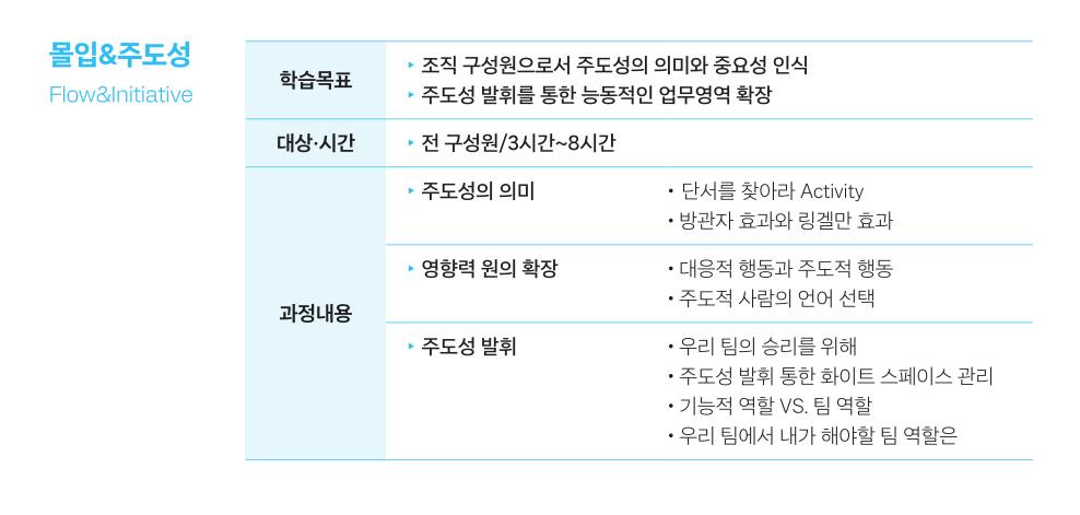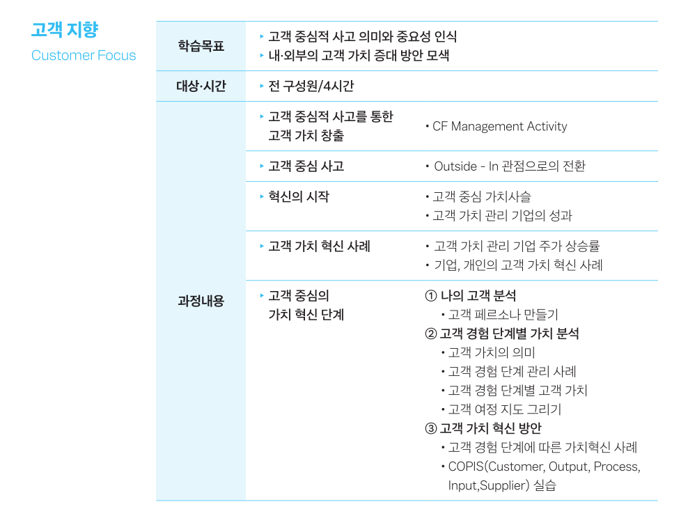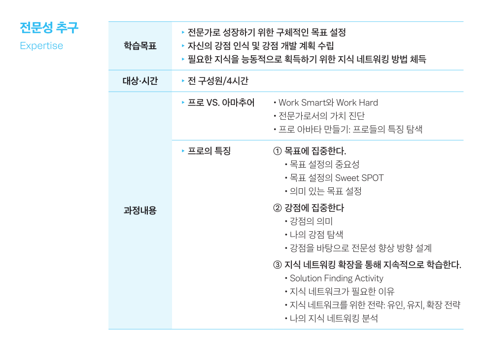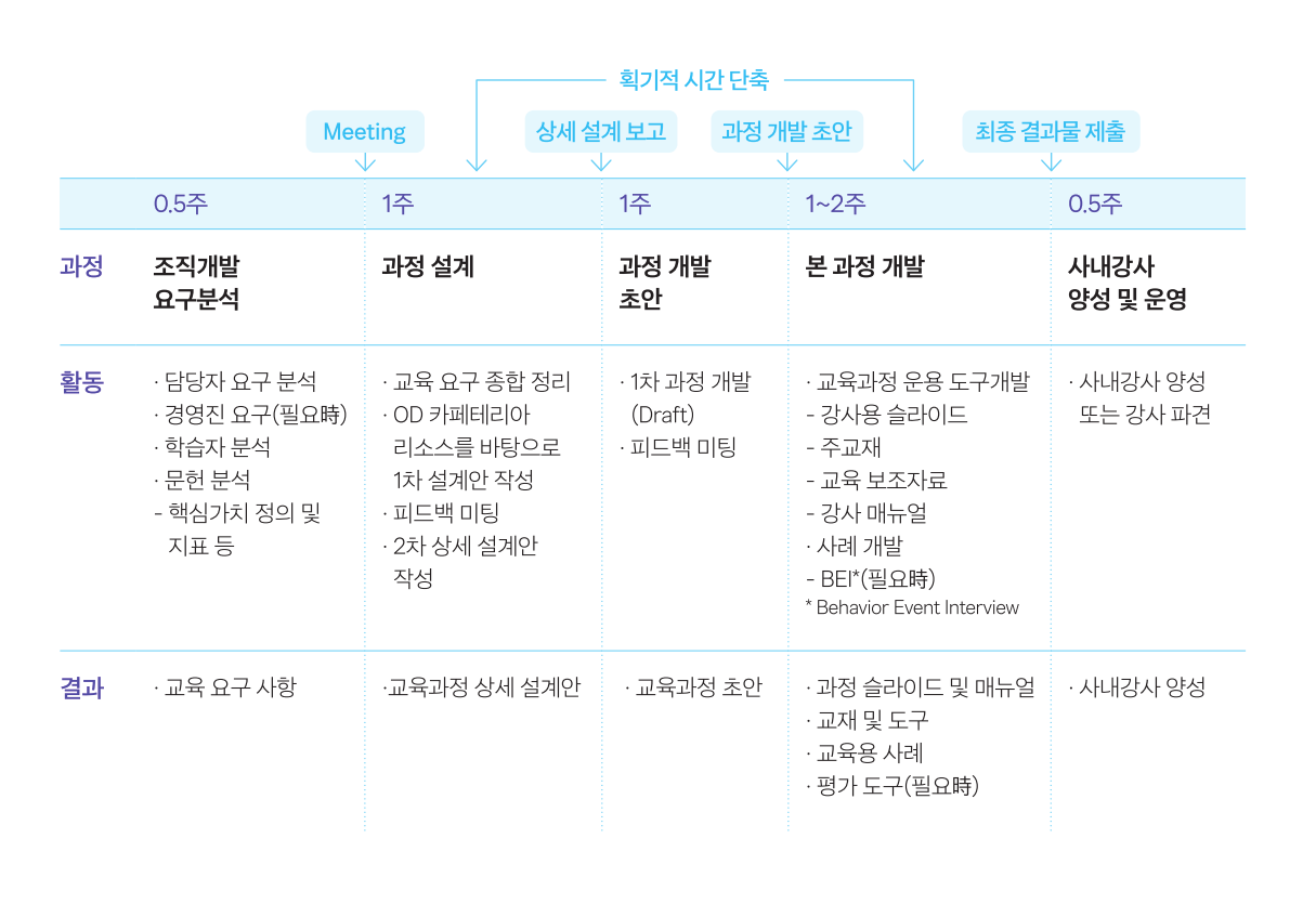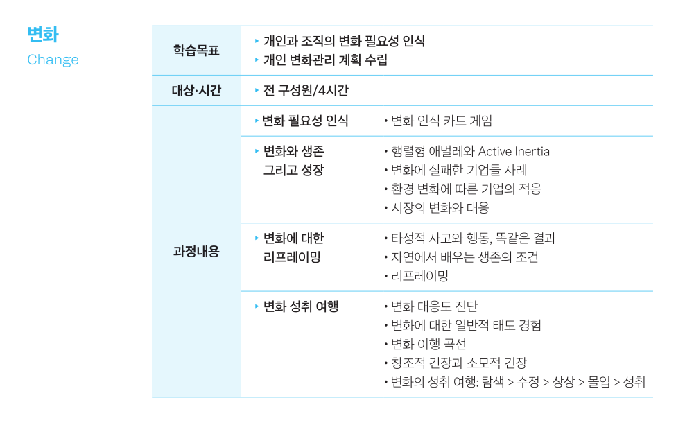 교육 대상자의 특성과 고객사의 니즈를 고려하여 구조화합니다.