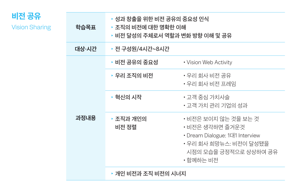 Refresh 차원의 조직 활성화 교육을 넘어, 교육을 통해 경영전략을 지원할 수 있도록 비전 내재화 가치 공유, 경영 방침 공유 등 조직문화 차원의 문제 해결을 통해 Alignment를 구축합니다.