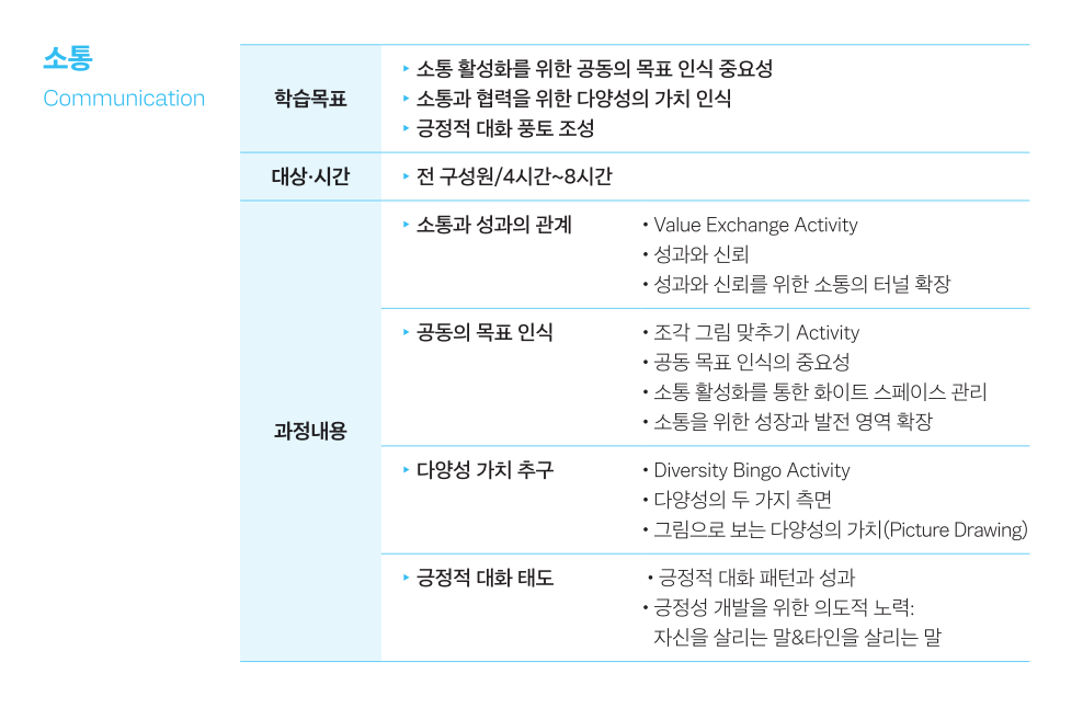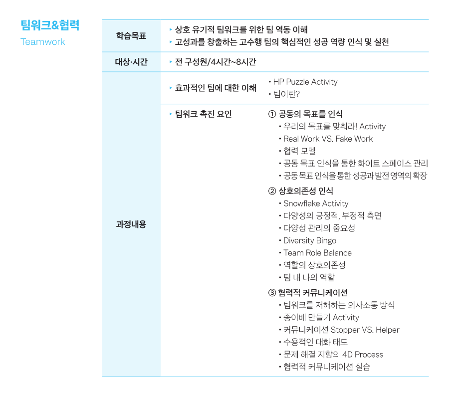 각 모듈은 참여자 특성과 조직 상황에 맞게 유연하게 설계됩니다.
