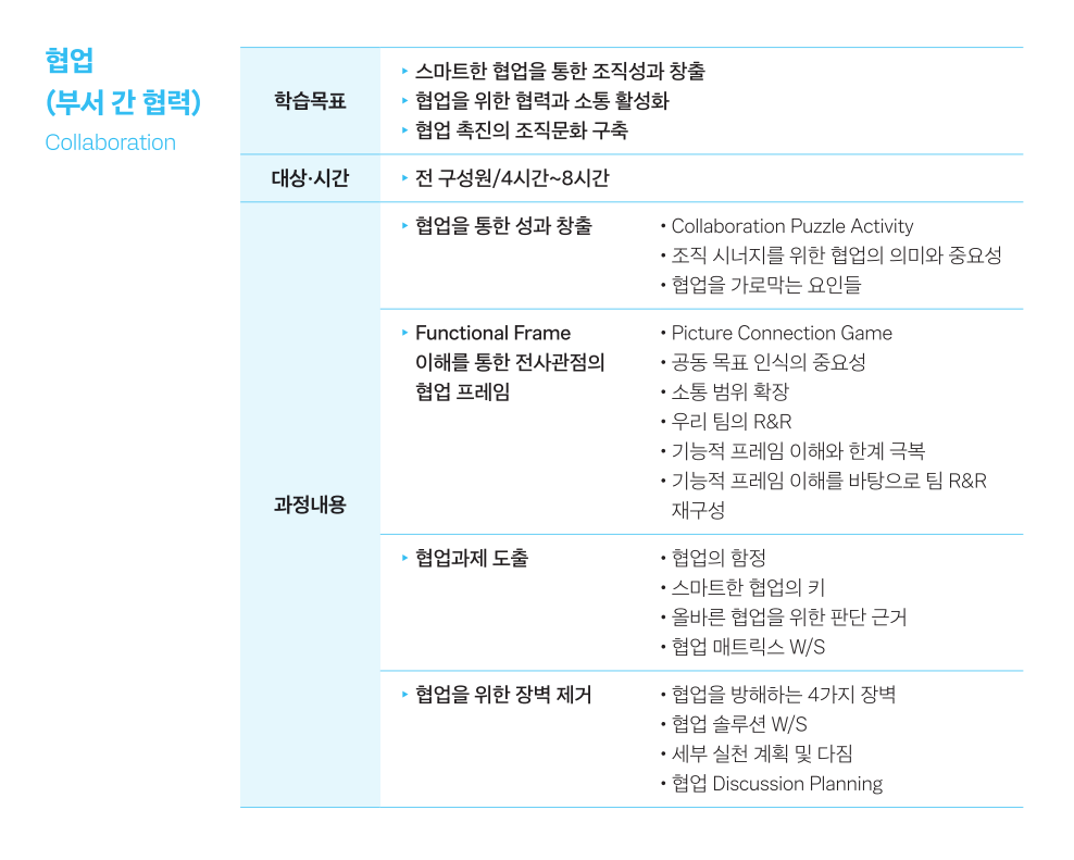 국내 30대 그룹과 100대 기업(매출액 기준)의 OD 핵심 이슈를 기반으로 구성되었으며, 지속적인 개발과 업데이트를 통해 기업의 조직개발 트렌드를 반영하고 있습니다. 각 모듈의 Experience는 교육 대상자의 특성과 고객사의 니즈를 고려하여 구조화합니다.